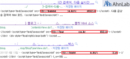 해킹된 사이트를 통한 악성코드 유포는 평일이면 잠잠하다가 주말이 시작되는 금요일 저녁부터 발생하여 토, 일요일에 집중되고 있습니다. 7월 네 번째 주에는 일부 블로그에서도 악성코드가 유포되는 것이 탐지되었는데요. 해당 블로그들의 공통점을 조사해 본 결과, 특정 업체에서 제공하는 배너광고 스크립트를 사용하고 있었습니다. 추가로 검색 사이트를 이용해서 검색해 본 결과, 아래 그림처럼 상당수의 블로그나 사이트에서 해당 배너광고 스크립트를 사용하고 있음을 확인할 수 있습니다.