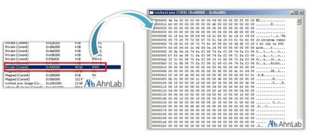 해당 파일이 실행 되면 윈도우(Windows) 시스템에 존재하는 정상 파일인 svchost.exe를 강제로 실행 시킨 후 아래 이미지와 같이 svchost.exe의 메모리 영역에 자신의 코드 전체를 강제로 덮어쓰게 됩니다.