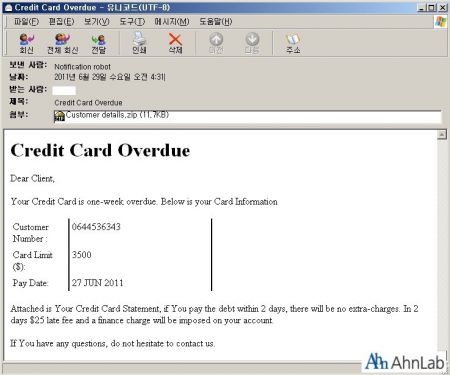 안녕하세요. 안랩인입니다. 한국 시각으로 2011년 6월 29일 새벽 사용하는 신용 카드가 한도를 초과 하였다는 메일로 위장하여 악성코드를 첨부 한 악성 스팸 메일(Spam Mail)이 유포 된 것이 발견되었습니다. 해당 악성 스팸 메일에 첨부된 악성코드를 실행하게 될 경우에는 특정 시스템으로부터 금전을 목적으로 한 허위 시스템 복구 프로그램을 다운로드 및 실행 하게 됩니다.