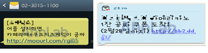 악성코드 제작자는 공격 대상을 정하면 ‘어플 설치하면 카페라떼+치즈케익이 공짜’ 등 사용자를 현혹하는 내용과 URL을 문자 메시지로 보낸다.