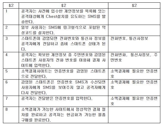 악성 앱이 실행되면 통신사 정보와 스마트폰 번호가 악성코드 제작자에게 전송된다. 악성코드 제작자는 정보를 확보한 후 즉시 소액결제를 시도하고 이때 수신된 인증번호를 사용자 몰래 가로채서 금전을 탈취한다.