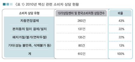 안녕하세요. 안랩인입니다. 불량 백신에 관한 대부분의 민원은 요금, 즉 금전적 피해와 관련된 것입니다. 부당한 자동연장결제, 반복된 요금 청구, 요금인상에 대한 미고지, 계약 해지불가 등이 대표적인 예입니다. 프로그램 이용료가 어떻게 처리되는지 모르거나, 결제가 이뤄지고 있는 것 자체를 몰라 피해가 발생하고 있는 것이죠. 실제로, <표 1>처럼 2010년 한 해 동안 한국소비자원에 접수된 불량 백신에 대한 민원 상담건수는 612건으로 나타났으며, 이중 결제와 관련된 금전적 피해 상담의 비중은 43%인 것으로 집계되었습니다.