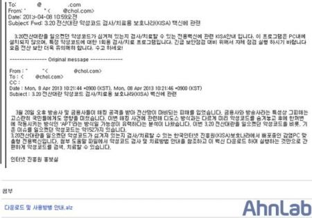 공격자는 chol.com의 메일 계정을 사용해 chol.com 메일 계정을 가진 특정인에게 이메일을 보낸다. 메일 제목은 ‘3.20 전산대란 악성코드 검사/치료용 보호나라(KISA) 백신에 관련’이며, 본문은 ‘3.20 전산대란을 일으켰던 악성코드가 심겨져 있는지 검사/치료할 수 있는 전용백신에 관련 KISA 안내입니다.’로 시작된다. 본문 말미에는 ‘인터넷 진흥원 홍보실’로 메일 작성자를 가장했다.