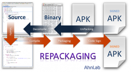 리패키징이란 앱의 제작 과정을 거꾸로 하여 앱의 최초 형태인 소스 코드로 변환한 후 소스 코드를 수정하거나 다른 코드를 삽입하고 앱을 다시 제작하는 일련의 과정을 말합니다.