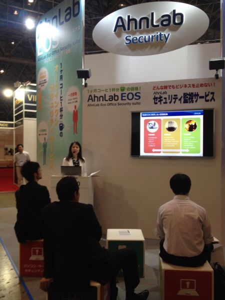 안랩 재팬이 이번 전시회에 출품하는 신제품인 ‘AhnLab EOS(Eco Office Security Suites)’는 PC 절전 모니터링, 기업 자산관리, 모바일을 포함한 엔드포인트 보안 및 단말 분실관리 등 포괄적인 보안을 제공하는 SaaS(Software As a Service)형 통합관리 서비스이다. PC와 모바일, 태블릿을 분리하여 제공하던 기존 서비스를 하나로 통합하여 관리 편의성을 높인 것이 특징이다. 2011년부터 통합관리에 대한 수요가 증가하고 있는 일본 시장에 특화된 서비스이다.