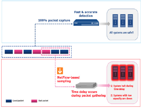 사전에 정해놓은 비율에 따라 샘플링을 하여 분석하는 플로우(Flow)기반의 분석 방식의 대응력이 우려되는 것도 이러한 이유 때문이다.