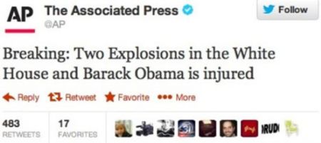 AP통신에 의하면, 자사의 트위터 계정1이 피싱 공격을 받아 해커가 임의로 작성한 '속보: 백악관에서 두 건의 폭발사고 발생해 오바마 대통령이 부상당함'이라는 트윗이 게재된 사건이 발생했다. 미국 동부시간 16일 오후 1시 직후에 보내진 이 트윗은 트위터 사용자들을 공포로 몰아넣었고, 주식시장에선 다우존스 산업평균지수(Dow Jones Industrial Average)를 143포인트나 떨어지게 만들었다.