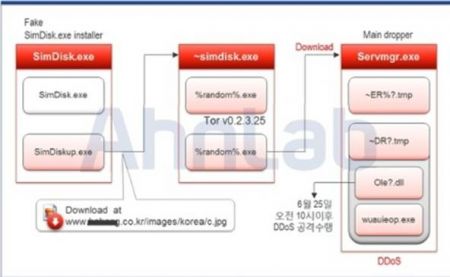 한편, 정부통합전산센터 웹사이트를 디도스 공격한 8개의 악성코드는 각기 역할이 나눠져 있다. 사용자가 웹하드 관련 업데이트 파일로 오인해 SimDiskup.exe 파일을 실행하면 ~simdisk.exe 파일이 생성되고 디도스 공격을 수행하는 oleschedsvc.dll 파일을 다운로드한다. (보충자료)