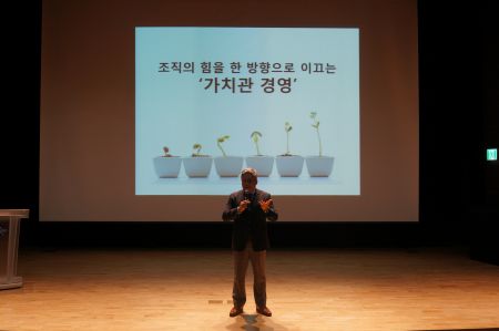 이 후 외부 강연자 특강시간이 진행됐다. ‘가치관 경영’이라는 테마로 진행된 이번 강연은 기업에서 조직의 ‘가치관’이 얼마나 중요하며 어떤 역할을 하고 있는지에 대해 다양한 사례를 통해 전달했다. 그는 크게 ‘가치관 경영이란 무엇인가,’ ‘가치관 경영은 어떻게 활용하는가,’ ‘가치관을 살아 움직이게 만드는 법’ 이라는 세 가지 섹션으로 나누어 설명했다. 강연자로는 IGM 세계경영연구원 가치관경영연구소 소장이자 중앙대학교 경영경제대학교 교수를 겸임하고 있는 양백 교수가 나섰다.