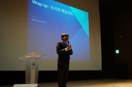 마지막으로 김기인 CFO가 나와'끊임없는 연구개발로 함께 사는 사회에 기여한다'라는 안랩의 미션과 3가지 핵심가치 의의에 대한 이야기를 전했다. '자기개발(자신의 발전을 위하여 끊임없이 노력한다)'과 '상호존중(존중과 신뢰로 서로와 회사의 발전을 위하여 노력한다),' 그리고 '고객만족(고객의 소리에 귀를 기울이고 고객과의 약속은 반드시 지킨다)'는 세 가지 핵심가치가 안랩의 존재 이유이며, 우리가 나아가야 할 방향이란 메시지와 함께 강연을 마쳤다. <Ahn>