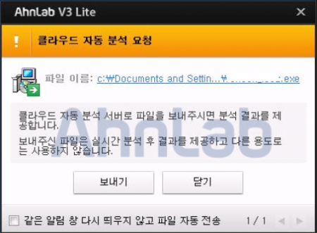 즉, 이러한 알림 창은 악성코드를 진단한 것이 아니라 현재 사용자의 시스템에서 분석되지 않은 의심파일이 존재할 경우 해당 파일을 실시간으로 분석하기 위해 클라우드 자동분석 서버로 전송 여부를 묻는 알림이다.