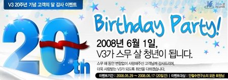 한편, 안철수연구소는 V3 탄생 20주년을 맞아 6월을 ‘고객의 달’로 선포하고, 다채로운 사은 행사를 개최합니다. 블로그에서는 ‘V3의 활약상을 찾아라’ 등의 이벤트로, ‘V3 관련 OX 퀴즈’ 등의 홈페이지 이벤트(http://kr.ahnlab.com/info/event/2008/20th/event20th.ahn)를 개최하고, ‘기업고객 세미나’를 개최해 V3의 고객 중심 철학을 공유할 계획입니다. 아울러 회사의 역사를 일반 직원들의 시각에서 조명한 에세이형 사사를 경영/경제 서적 전문 출판사인 김영사를 통해 단행본으로 출간할 예정입니다.