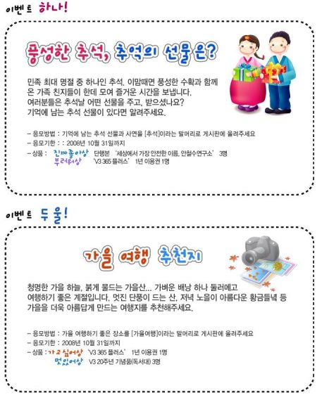 기억에 남는 추석 선물과 떠나기 좋은 가을날, 추천 여행지를 소개해 주시면, 추첨을 통해서 빠르고 가벼운 백신 'V3 365 클리닉 2.0' 1년 사용권과 단행본 '세상에서 가장 안전한 이름, 안철수연구소', V3 20주년 기념품(독서대)를 드립니다.