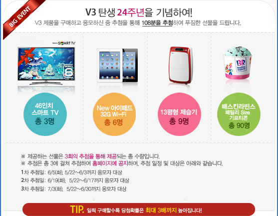 AhnLab EVENT V3 탄생 24주년 기념 스마트TV, 뉴아이패드 증정 보안세상 2020. 4. 27. 19:03 2012.05.29 안녕하세요. 안랩인입니다. 저희 안랩에서 V3 24주년을 기념해 특별 이벤트를 준비 했습니다! 독자 여러분의 많은 참여 부탁 드립니다! ^^