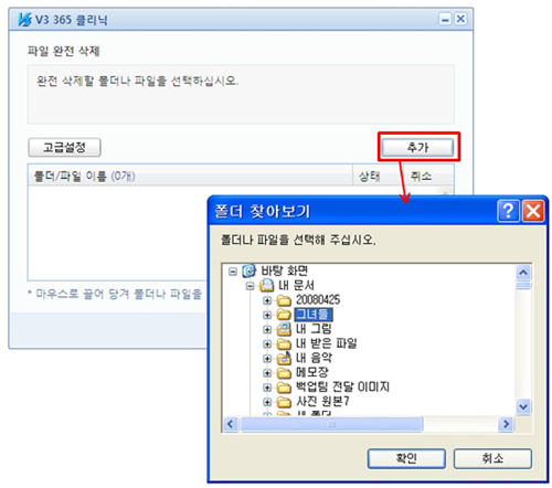 그림2) [추가] 버튼을 클릭하여 나타난 창에서 완전 삭제를 원하는 폴더나 파일을 직접 선택