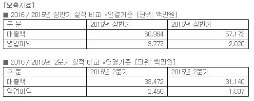 2016년 2분기의 연결기준 매출액은 335억원, 영업이익은 25억원(별도기준 매출액: 328억원, 영업이익: 23억원)을 기록했다.