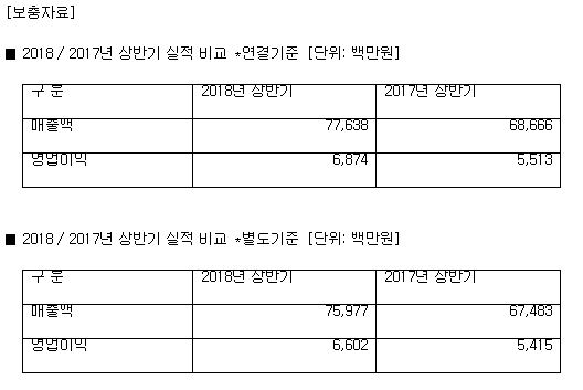 2018년 2분기 연결기준 매출은 400억원, 영업이익은 46억원(별도기준 391억원, 영업이익 44억원)을 기록했다. 이는 전년 동기 대비 매출과 영업이익이 각각 42억원, 9억원 증가(별도기준 40억원, 8억원 증가)한 수치다.