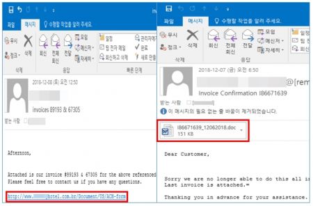 먼저 공격자는 크리스마스와 연말 선물 등 온라인 구매가 많아지는 최근 시기에 ‘Invoice 000(랜덤숫자)’, ‘Invoice Confirmation(송장 확인)’ 등 해외 거래 송장으로 위장한 메일을 발송해 사용자의 의심을 피했다. 공격자는 해당 위장메일에 문서 파일(.doc)로 된 악성파일을 직접 첨부하거나, 악성 URL을 포함시켜 악성파일을 다운로드 유도하는 방식으로 악성코드를 유포했다(보충자료 1 참조).