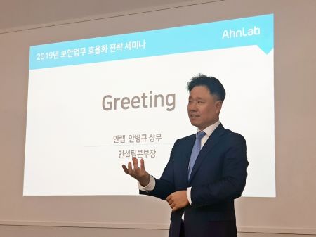 안랩 컨설팅본부 안병규 상무가 '2019 보안업무 효율화 전략 세미나'에서 인사말을 하고 있다.