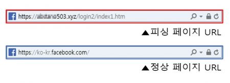 [보충자료2] 피싱 페이지 URL(위)과 정상 페이지 URL (아래)
