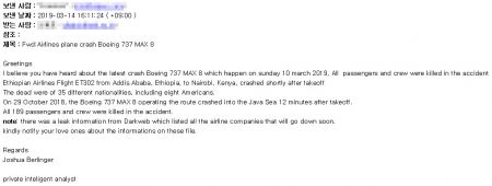 이번에 발견된 악성 메일에는 최근 발생한 '보잉737 맥스8 여객기 추락 사고’ 요약과 “다크웹에서 유출된 (해당 기종을 이용하는)위험 항공사의 리스트를 첨부했으니 주위 가까운 사람들에게 알려주어라”는 내용이 포함돼 있다(보충자료 참고). 이와함께 ‘MP4_142019.jar’ 이름의 악성 자바 파일도 첨부되어 있다.