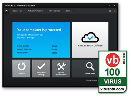 안랩(대표 권치중, www.ahnlab.com )의 통합 PC 보안 솔루션 ‘V3 Internet Security 9.0(이하 V3)’이 글로벌 안티바이러스 평가 기관 ‘바이러스 불러틴(Virus Bulletin, www.virusbulletin.com )’이 실시하는 2019년 12월 ‘VB100’ PC 보안제품 인증 평가에서 만점으로 인증을 획득했다.