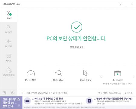 안랩(대표 권치중, www.ahnlab.com) 은 개인 사용자용 무료 PC 백신인 ‘V3 Lite’의 알림 배너와 모바일 보안 앱인 ‘V3 Mobile Plus’의 알림장 기능을 활용해 중앙재난안전대책본부, 질병관리본부 등 정부에서 제공하는 ‘코로나바이러스감염증-19(이하, 코로나19)’ 공식 정보를 PC와 모바일 사용자에게 알린다.