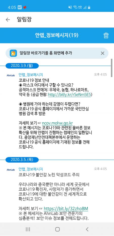 또, 모바일 사용자의 경우 ‘V3 Mobile Plus’에서 제공하는 알림장 기능(이미지 2)으로 매주 코로나19와 관련된 최신 정보를 확인할 수 있다. 함께 제공되는 URL을 클릭하면 자세한 정보 확인이 가능한 웹 페이지로 연결되어 쉽게 자료를 찾을 수 있다.