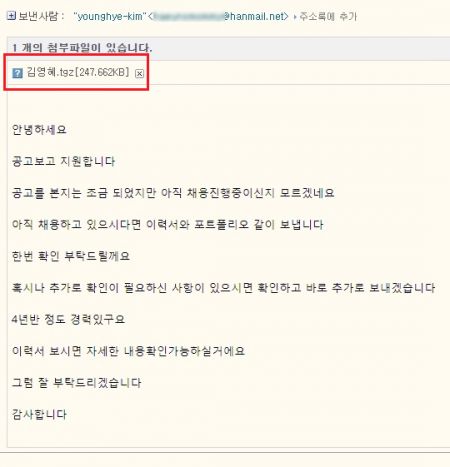 [보충자료] 이력서 위장 악성메일 캡쳐