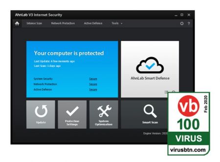안랩(대표 강석균, www.ahnlab.com )의 통합 PC 보안 솔루션 ‘V3 Internet Security 9.0(이하 V3)’이 글로벌 안티바이러스 평가 기관 ‘바이러스 불러틴(Virus Bulletin, www.virusbulletin.com )’이 실시하는 2020년 첫 ‘VB100’ PC 보안제품 인증 평가에서 진단율 100%로 인증을 획득했다.