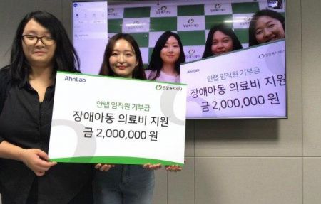 안랩은 코로나19로 인해 대다수 임직원이 원격근무 중 임에도, 많은 임직원이 소액 기부에 참여해 총 200만원의 기부금을 마련했다고 밝혔다. 밀알복지재단에 전달된 기부금은 무뇌수두증이라는 희귀 난치성 장애를 앓고 있는 영아의 수술비 및 치료비로 쓰일 예정이다.