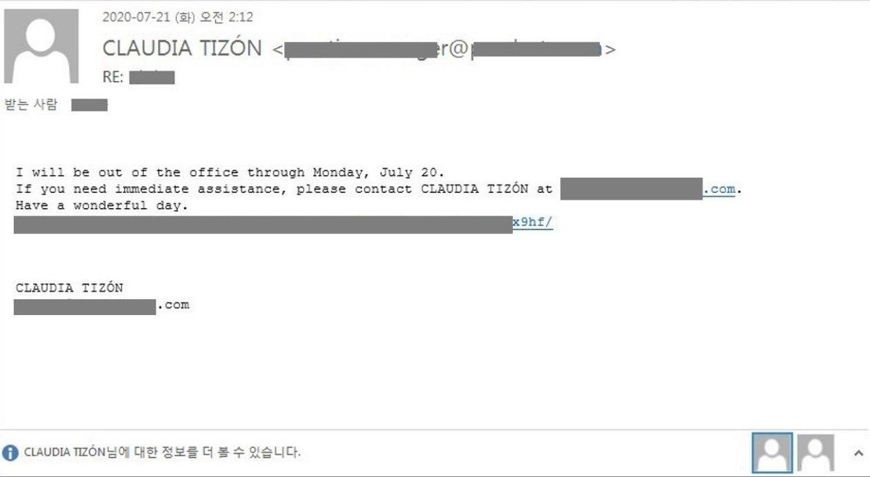 먼저 공격자는 “호텔 객실을 확인하세요”, “부재중입니다. △△△(임의 연락처)으로 연락주세요 (악성 URL)” 등 호텔 예약/결제, 업무 담당자 부재 중 자동 회신 등 같이 최근 여름 휴가 시기에 사용자가 속기 쉬운 내용으로 위장한 피싱 메일을 발송했다.
