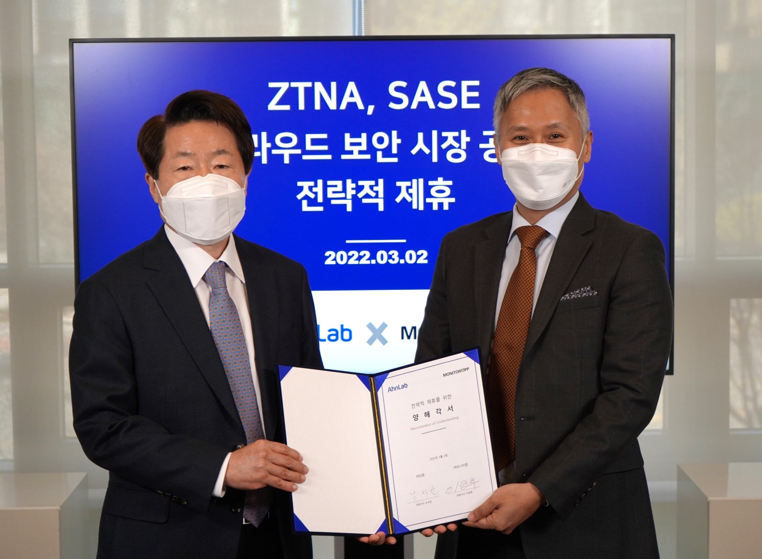- 3월 2일(수), 안랩 사옥에서 모니터랩과 투자 계약 및 ‘ZTNA, SASE 등 클라우드 보안 시장 공략을 위한 전략적 제휴 MOU’ 체결