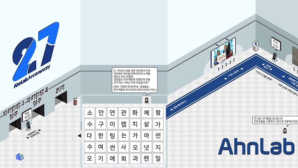 안랩은 3월 11일 열린 창립 27주년 기념행사에도 기부를 연계해 임직원에게 다양한 기부 경험을 제공했다. 게더타운에 구현한 ‘안랩 월드’에 ‘위기 가정에 응원 메시지 남기기’ ∙ ‘미로 찾기’ 등의 퀘스트를 주고, 임직원이 퀘스트(*)를 완료할 때마다 2,700원을 회사가 기부하는 방식이다. 미로를 통과하기 위해서는 ‘끊임없는 연구개발로 함께 살아가는 사회에 기여한다’라는 안랩의 미션(Mission)을 따라가도록 하여, 참여 임직원이 나눔의 의미를 되새길 수 있게 했다.