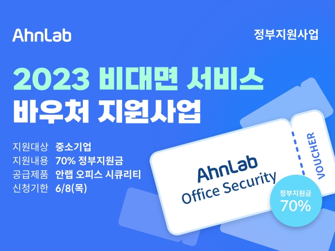 안랩(대표 강석균, www.ahnlab.com )이 2023년 ‘비대면 서비스 바우처 지원사업(보충자료 참고)’의 공급기업으로 2년 연속 선정되어 중소기업을 대상으로 보안 솔루션을 제공한다.
