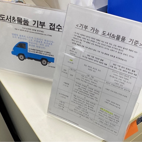접수처 안내판의 QR코드를 찍으면 기부 신청서를 작성할 수 있었는데요. 간단한 개인정보를 입력하고, 가져온 물품을 품목별로 구별해서 기입하면 끝입니다. 품목 구분이 헷갈릴 때는 품목 구분이 헷갈릴 때는 <기부 가능 도서&물품 기준> 안내판에서 바로 확인할 수도 있었습니다!