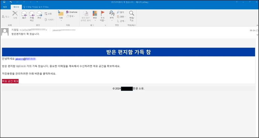 ‘이메일 저장용랑 관리’ 안내 메일로 위장한 피싱메일(보충자료 1 참조)에서 공격자는 먼저, ‘받은편지함이 꽉 찼습니다’라는 제목의 피싱 메일을 유포했다. 메일 본문에는 ‘받은 편지함이 가득 차 저장용량이 부족하다’며, ‘중요한 이메일을 계속해서 수신하려면 여유 공간을 확보하라’는 내용을 적어 ‘여유 공간 확보’ 버튼을 클릭하도록 유도했다.