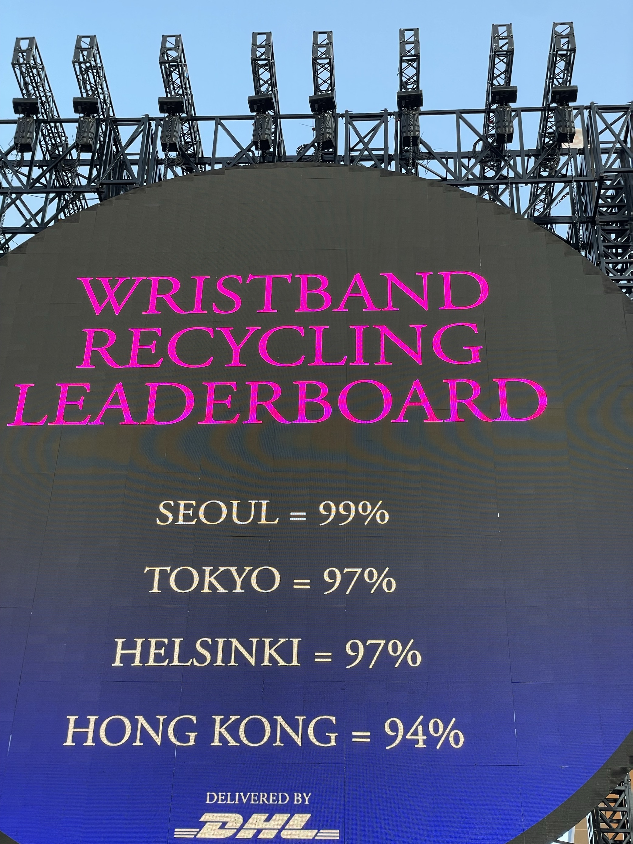 이번 콘서트에서 흥미로웠던 점은 총 6회의 공연이 진행되는 동안 각 공연이 끝날 때마다 도시 별 자일로밴드 회수율 현황을 전광판에 공개하면서 경쟁심을 유발했다는 점이었는데요. 이를 통해 사람들의 자발적인 참여를 이끌어냈고, 결국 서울(한국)이 최종 99%의 회수율로 1등을 차지하는 뿌듯한 결과를 얻었습니다. 물론 저도 공연이 끝나고 회수 바구니에 넣고 왔습니다!