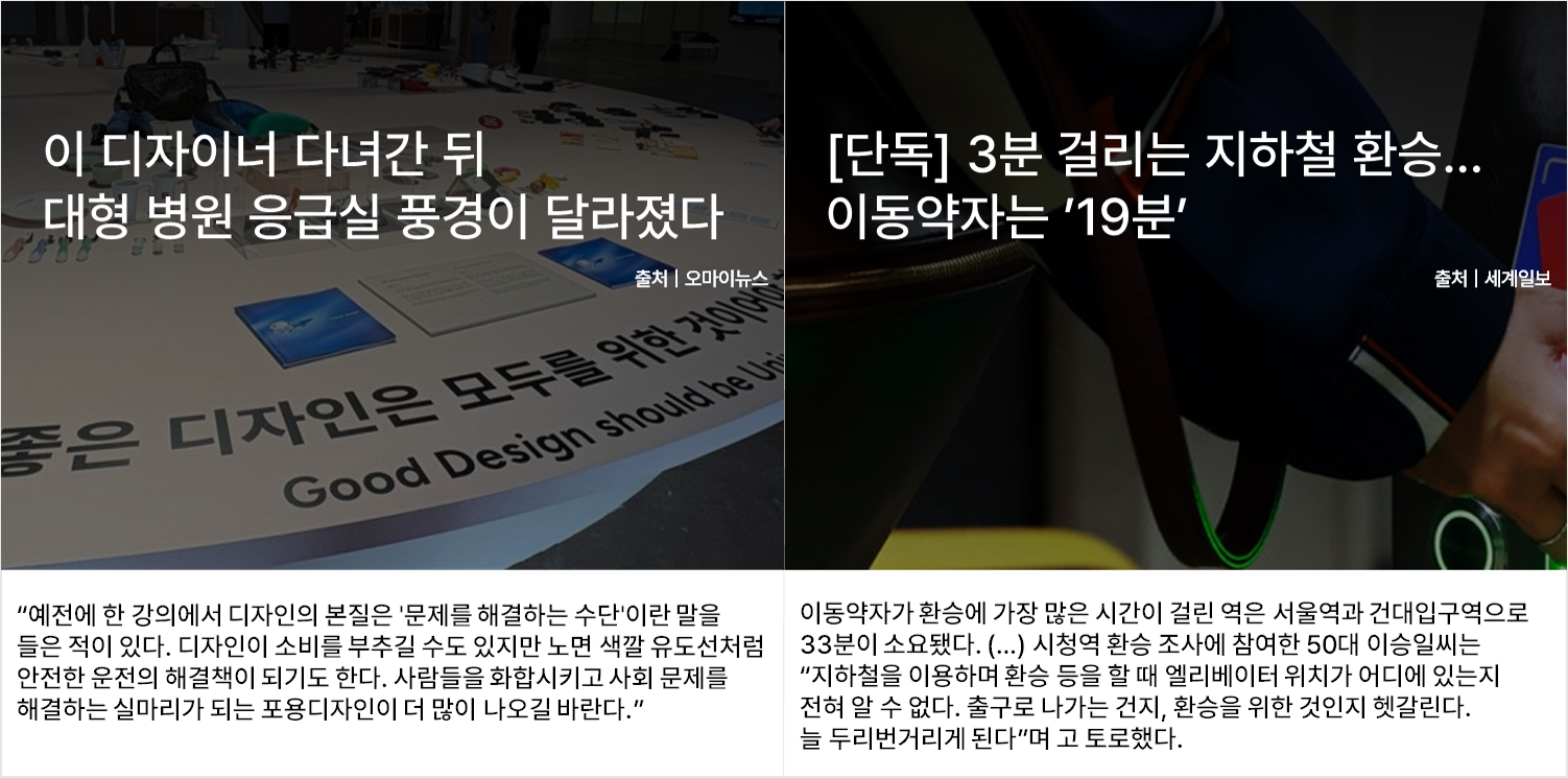 하나는 사회 문제를 해결할 수 있는 디자인에 대해서, 하나는 이동 약자의 불편을 초래한 디자인에 관해서 다루는 기사였습니다.