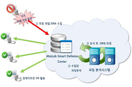 또한 종전에는 신종 파일 수집부터 분석, 엔진 제작 및 배포까지 6단계를 거쳐 약 2~5시간이 걸리는 데 반해 ‘스마트 디펜스’는 서버에 새 정보가 업데이트되면 실시간으로 PC에 그 정보를 전달할 수 있습니다. 따라서 신종 악성코드 분석 후 수분 이내에 분석 결과를 모든 PC가 활용할 수 있습니다.