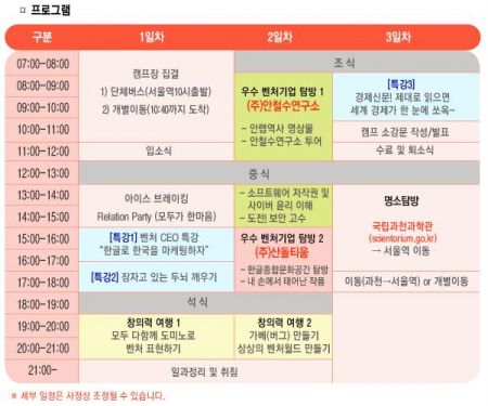 올 여름방학에는 벤처기업협회와 공동으로 2회에 걸쳐 실시하며, 2박 3일간 캠프 형식으로 진행됩니다.