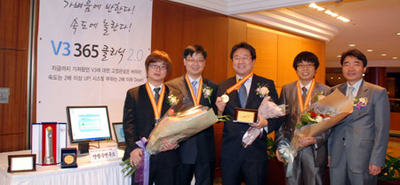 수상이 끝나고 V3 365 클리닉 개발의 주역들과 함께 기념촬영을 했습니다. 좌로부터 전진표 주임연구원, 최은혁 팀장, 김기인 상무, 김정훈 책임연구원, 김병훈 주임연구원 입니다.