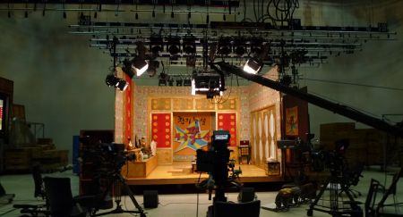 이제 무릎팍도사 녹화 세트장의 현장 모습입니다. 천장이 아주 높았고 전체 공간은 매우 큰편이었습니다. '천기누설 무릎팍도사' 세트장이 보입니다.