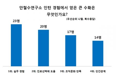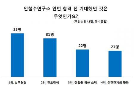 설문조사 결과 1위는 기대하기 전과 비슷하게 '실무경험'이었다고 대답했습니다. 대신 응답수가 골고루 분포된 결과가 나왔습니다. 조민아(분석1팀 인턴)씨는 컴퓨터공학을 전공 하면서 진로로는 오직 프로그래머, 전산 분야만 있는 줄 알았는데 인턴십을 하면서 다양한 길이 있음을 알았다고 합니다. “시야가 넓어졌다”라고 말했는데요. 보안 업계에 대해 막연히 생각했었는데 개발자 뿐 아니라 분석가 등, 세부적인 직업들을 찾게 되고 어떻게 준비해야 하는지 알게 됐다고 합니다.