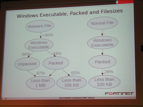 또한 악성코드의 90%는 윈도우 실행 파일이며 패킹되지 않은 파일이 66%, 패킹된 파일은 44%이며 97%의 파일이 1 메가바이트 이하의 길이를 가지는 것으로 밝혀졌다.