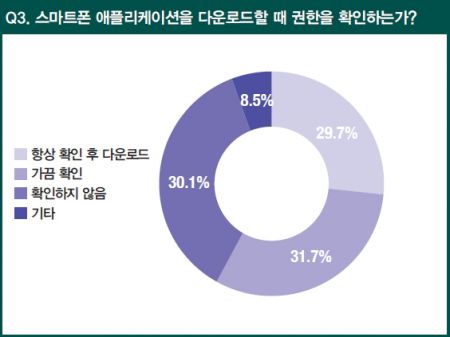 스마트폰 애플리케이션을 다운로드할 때마다 권한 정보를 확인하는 사용자는 전체의 29.7%로 나타났다. 이따금 확인한다고 응답한 31.7%를 합해도 61.4%로, 전체 사용자의 2/3를 넘지 못했습니다.