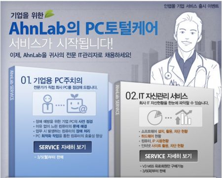 글로벌 보안 기업인 안랩(구 안철수연구소, 대표 김홍선, www.ahnlab.com)는 최근 중소기업용 보안 서비스 2종을 출시했다고 발표했다. 원격지원 서비스인 ‘기업용 PC주치의(http://v3clinic.ahnlab.com/v3clinic/site/bizremote/remoteMain.do)’와 IT 자산관리 서비스(http://v3mss.ahnlab.com/jsp/front/intro/intro_05.jsp)로 보안전문가가 부족한 중소기업의 보안 수준 제고에 나섰다.