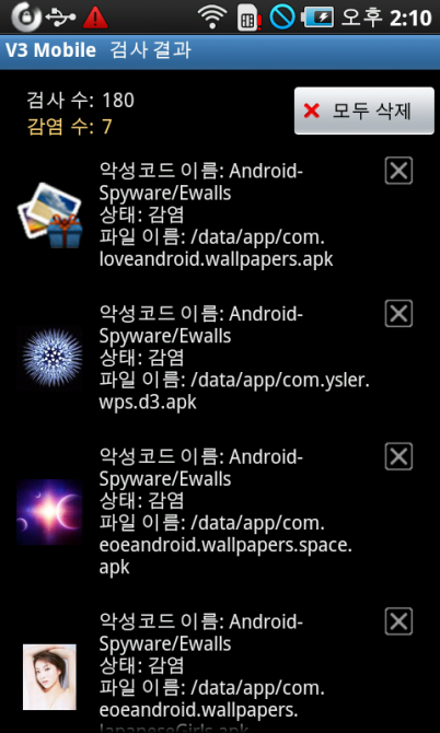 이번에 발견된 앱은 일종의 스파이웨어로서 정상적인 월페이퍼 앱 내부에서 사용자정보를 수집하고, 네트워크로 전달하는 기능이 들어 있습니다. V3 모바일 제품군은 이를 Android-Spyware/Ewalls라고 진단합니다.