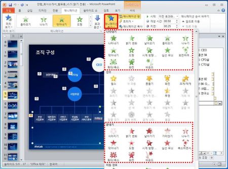 일반적으로 많이 사용하는 화면 전환 기법만 익혀도, 전문가 부럽지 않은 동영상을 제작할 수 있다. 슬라이드 시작과 끝에 ‘나타나기’, ‘밝기 변화’, ‘닦아내기’ 등의 애니메이션을 선택한 뒤 재생시간 및 지연시간을 설정한다.