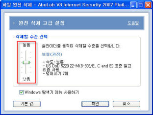 파일 완전 삭제 기능으로 파일을 삭제하면 파일을 풀 수 없도록 어렵게 암호화한 다음에 다른 데이터를 여러 번 덮어쓰기를 해서 삭제한다. 수준을 높게 설정할 수록 풀기 어려운 암호화 알고리즘을 사용하고 덮어쓰기 횟수도 늘린다. 수준을 어렵게 하면 그만큼 복구가 어려워지지만 파일을 완전 삭제하는 데에 시간이 많이 걸린다. 일반적으로 보통으로 설정하지만 좀 더 보안에 신경을 쓰고 싶다면 높음이나 아주 높음으로 설정하여 사용하면 된다.